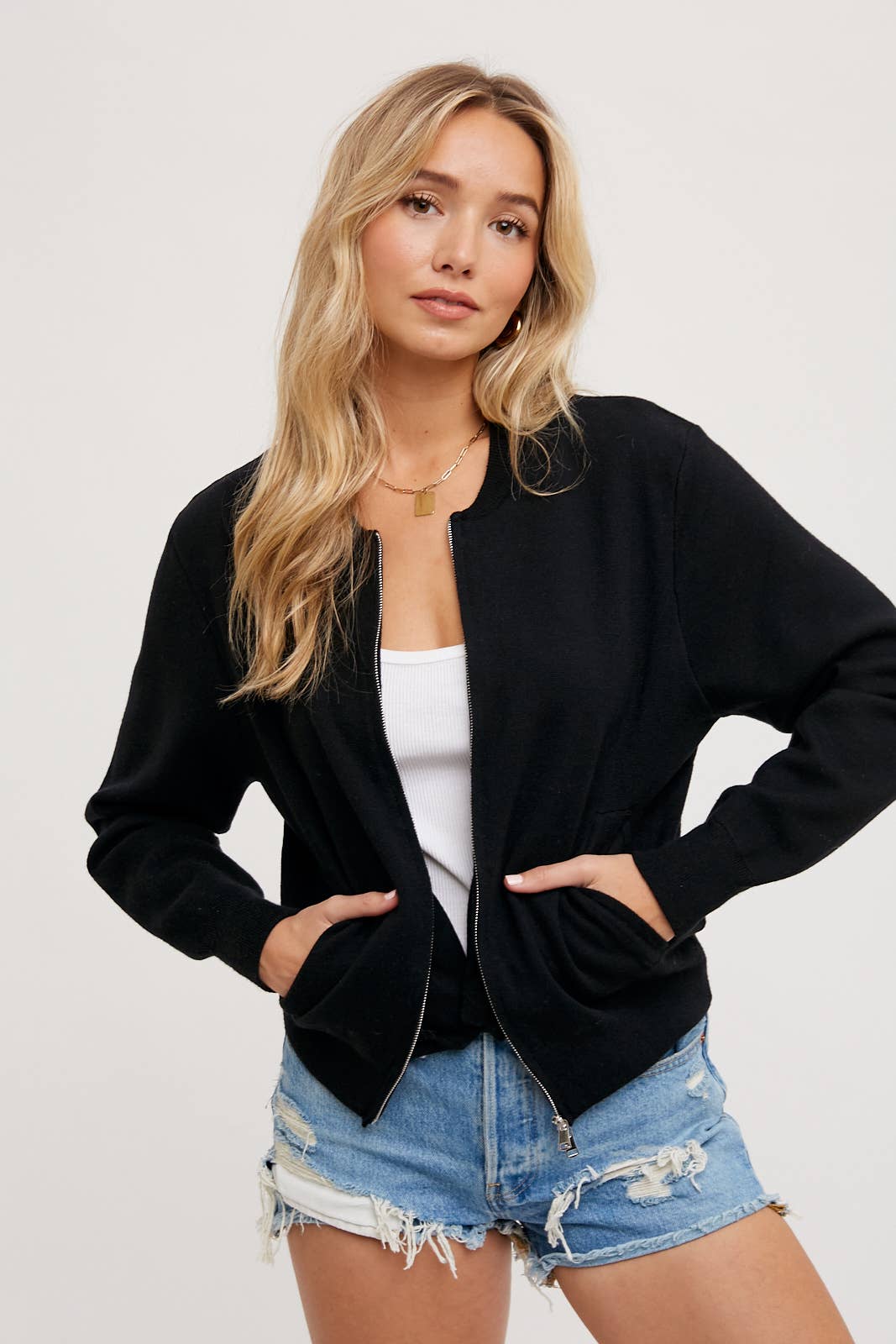 Featuring a classic zipper closure and convenient pockets, the Knit Bomber Jacket effortlessly combines functionality with fashion. Its timeless design and understated elegance make it the perfect addition to any wardrobe, suitable for everyday wear.